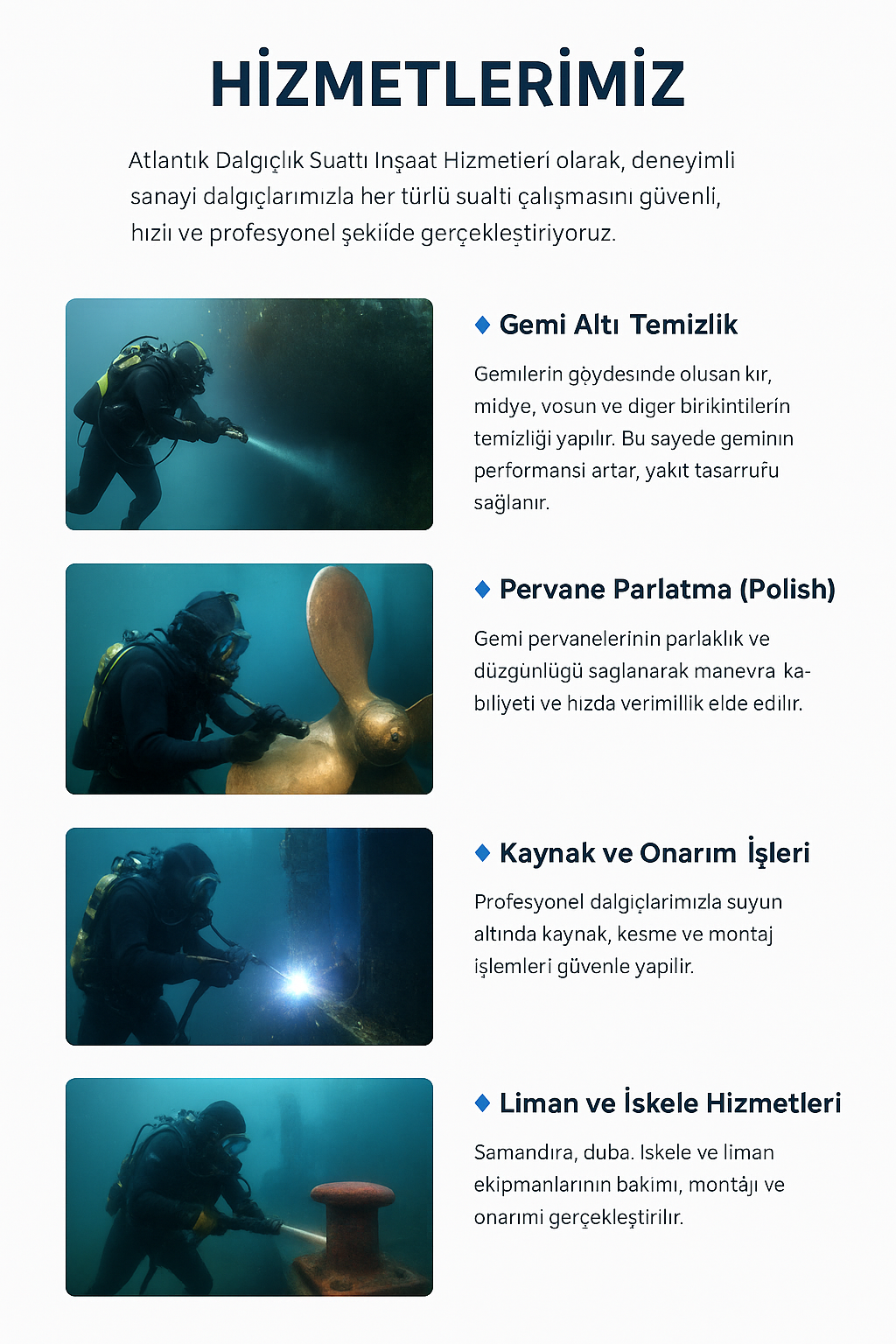 Denizin derinliklerinde güven ve kalite arıyorsanız, doğru yerdesiniz! Atlantik Dalgıçlık Sualtı İnşaat Hizmetleri LTD, gemi altı bakımı, dubalar ve şamandra bakımı, boru hattı döşeme, iskele yapımı ile liman onarımı ve yapımı gibi su altı hizmetlerinde uzmanlaşmıştır. Deneyimli dalgıç ekibimiz ve son teknoloji ekipmanlarımız ile her projeyi güvenle, hızlı ve titizlikle tamamlıyoruz. Her işimizde güvenlik, kalite ve müşteri memnuniyetini ön planda tutuyoruz. Atlantik Dalgıçlık olarak, su altı inşaat ve bakımda fark yaratıyoruz. İster küçük bir bakım işi, ister büyük bir liman projesi olsun, her zaman profesyonel çözüm ve yenilikçi yaklaşım sunuyoruz Siz de su altı projelerinizde güveni ve kaliteyi deneyimlemek ister misiniz? Atlantik Dalgıçlık ile derinlere güvenle inin!