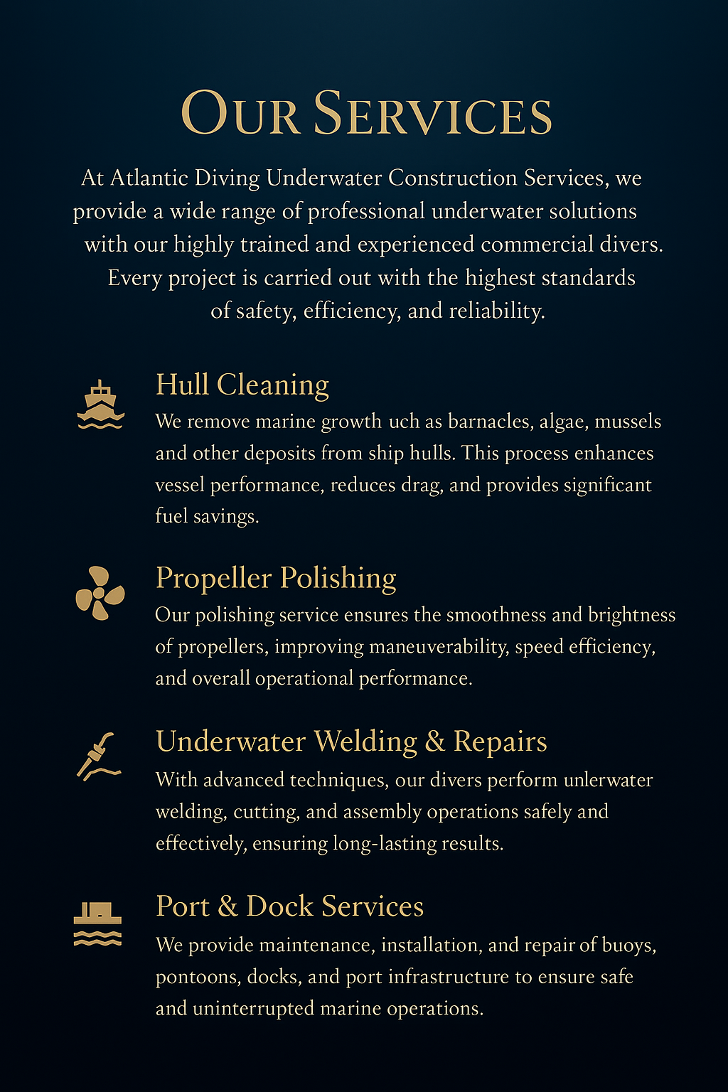 Atlantik Diving Underwater Construction Services, we carry out all types of underwater work safely, quickly, and professionally with our experienced industrial divers.